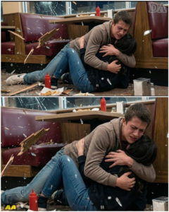 The boy threw himself over the girl, his much larger frame acting as a human shield against the rain of debris.