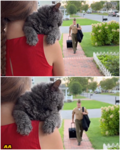 The moment the soldier’s boots finally met the edge of the brick walkway, the tension that had held the grey cat’s body rigid for months finally began to dissolve. From its high vantage point on the woman’s shoulder, the cat watched as the man in the tan uniform let go of his heavy black suitcase, allowing it to stand as a discarded monument to his time away. The soldier’s smile was not just for the camera or the neighborhood; it was a visible release of a year’s worth of longing, his eyes fixed on the fluffy sentinel that had served as his wife’s constant companion during the lonely nights.