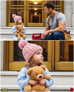 As Leo walked toward the grand, golden-framed glass doors of the main entrance, he stopped in his tracks. Sitting alone on the vast expanse of white marble stairs was a tiny figure that looked entirely out of place in such a sterile, corporate environment. It was a little girl, no older than five, wearing a soft blue dress and a thick pink knitted beanie with a large pom-pom.